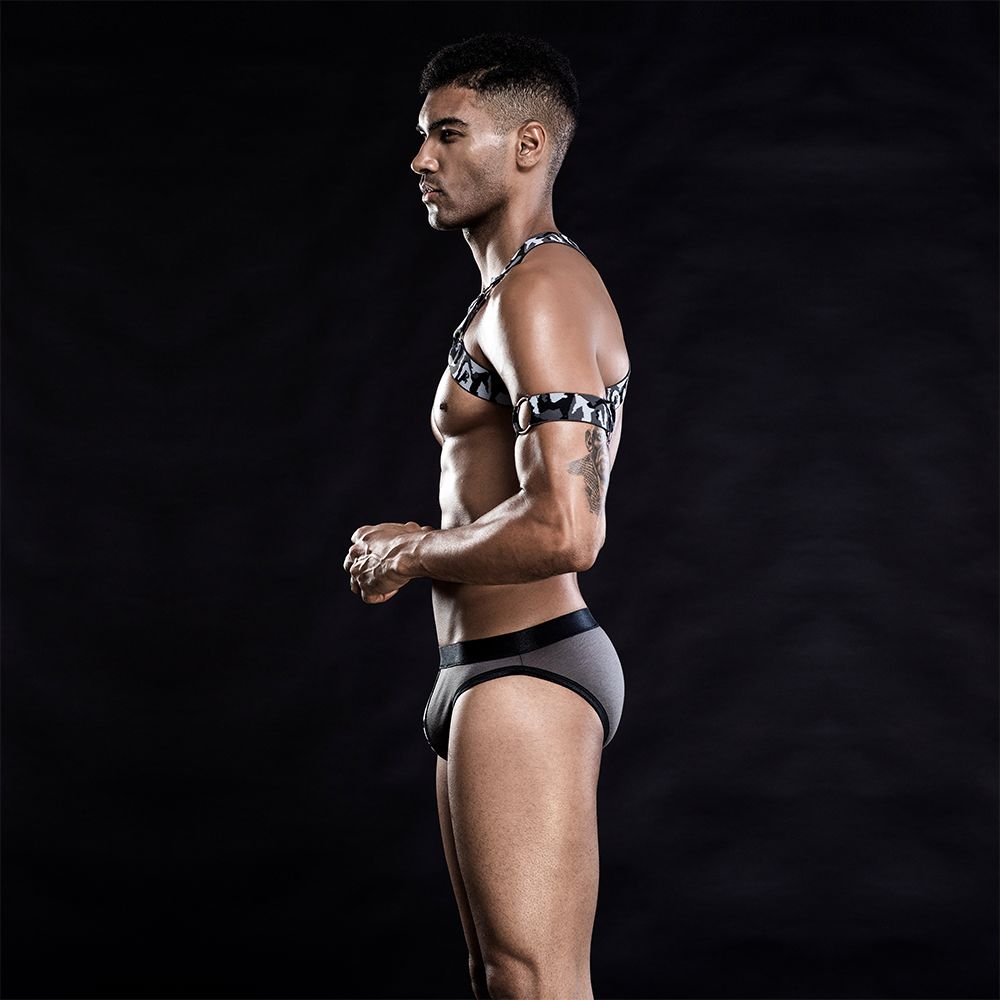Класичні труси-плавки облягають тіло, підкреслюючи розміри твого бійця за рахунок вертикальної вставки. Додаткова портупея на груди і біцепси створює потужний образ суворого сексуального воїна, який може практично все.