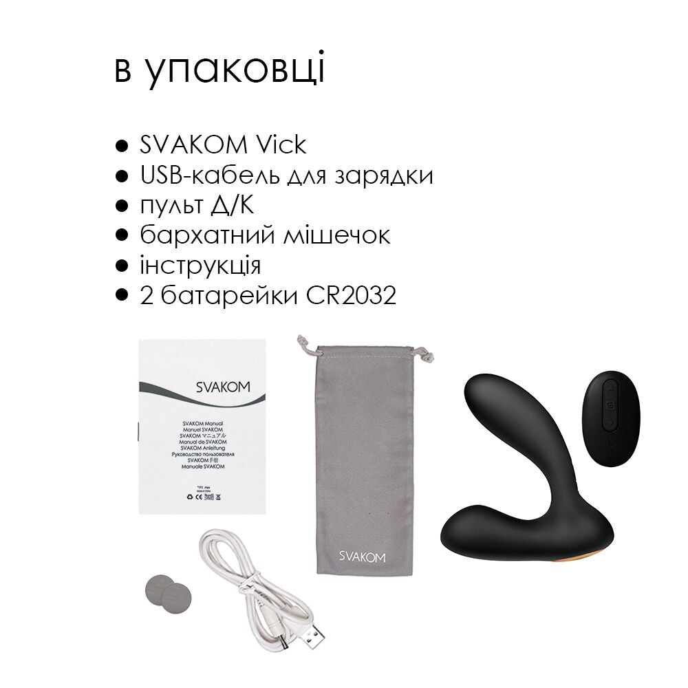 У пакованні: SVAKOM Vick + оксамитовий мішечок + інструкція + USB-кабель для заряджання + 2 батарейки CR2032.
