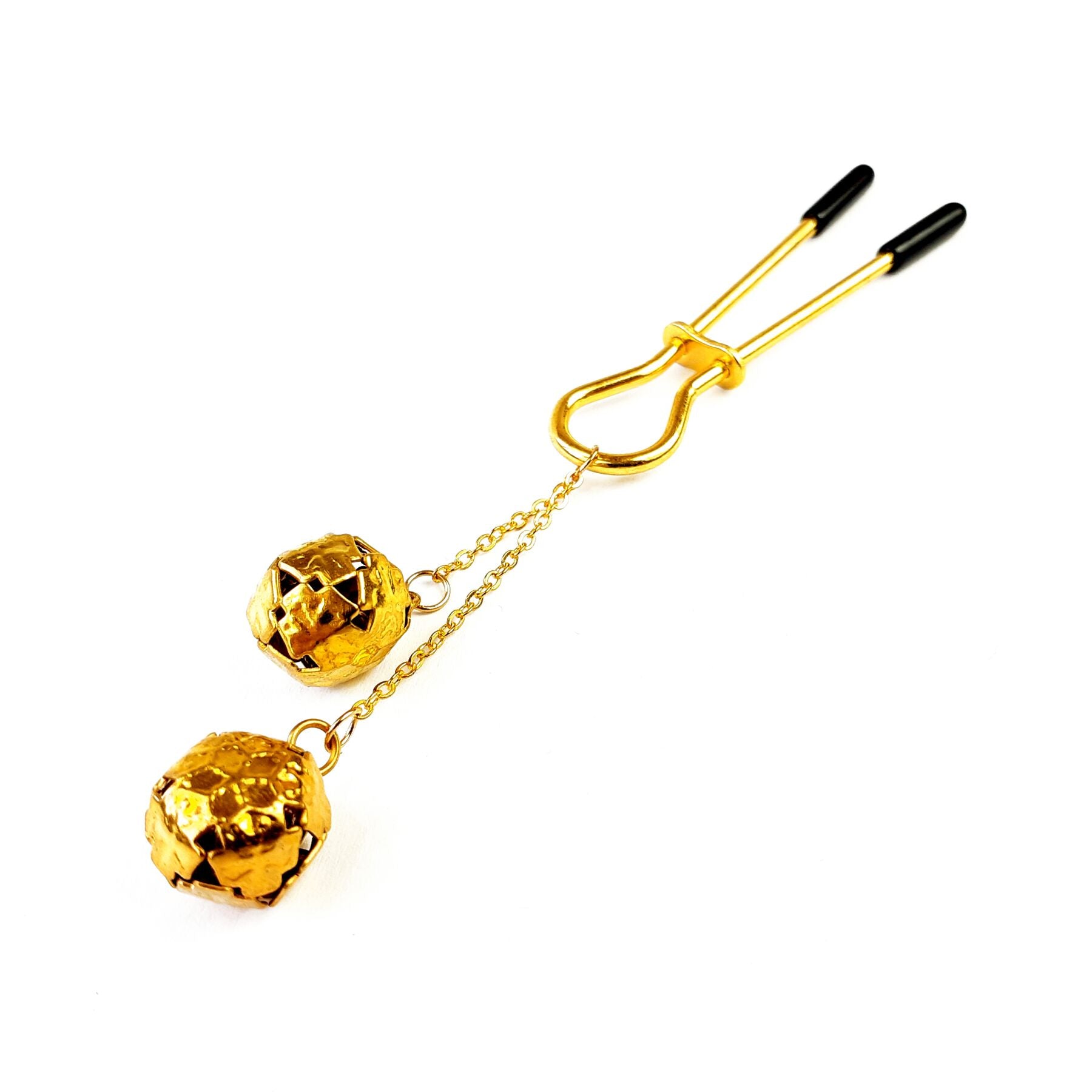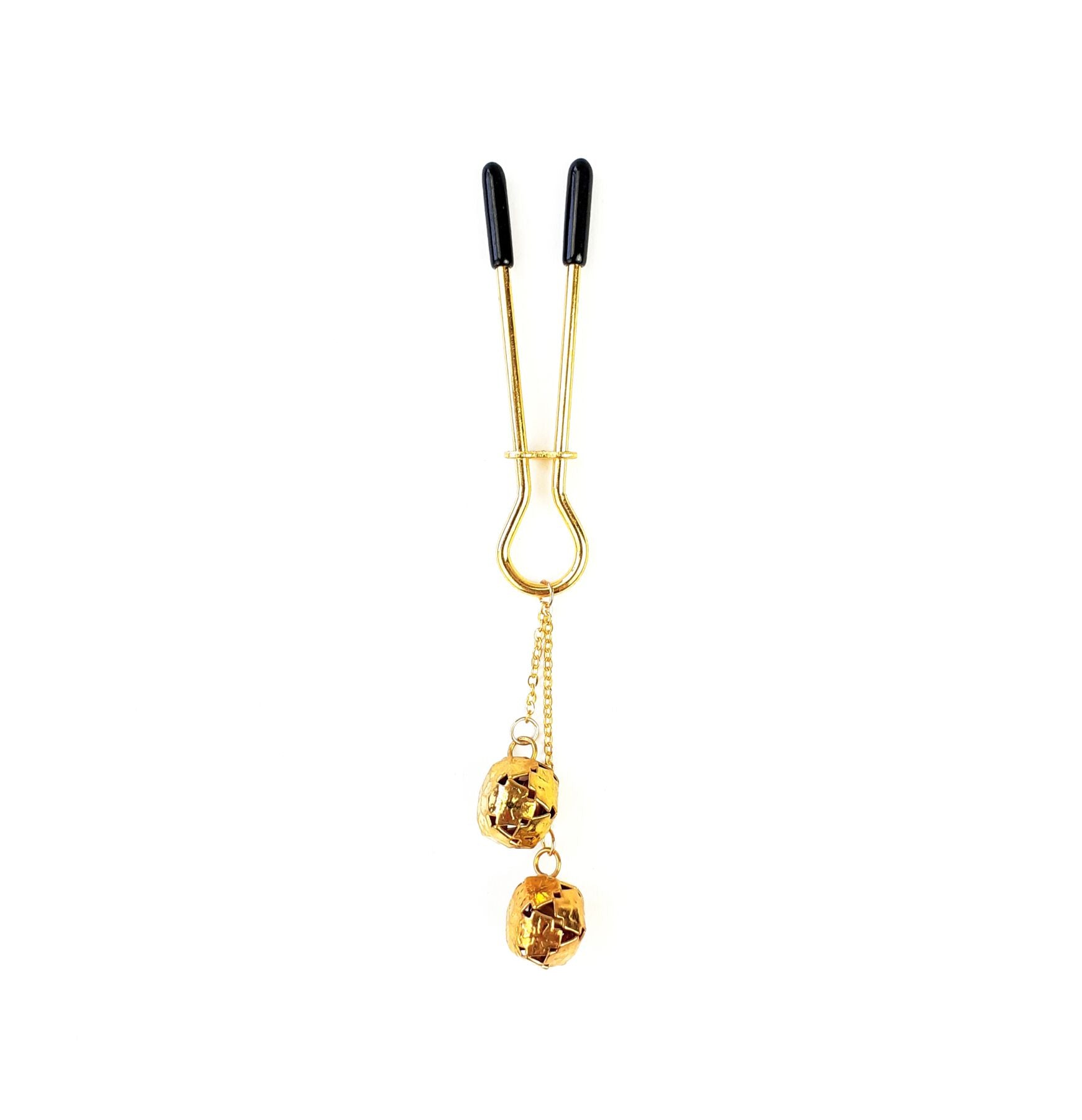 Затискач для клітора з бубонцями Art of Sex — Beverly clit clamp, Золото — стильний і лаконічний кліторальний затискач у золотому кольорі. Затискач прикрашений металевими дзвіночками, які грайливо дзвенітимуть у такт із рухами тіла. Затискач для клітора стане в пригоді любителям гострих відчуттів та експериментів з яскравою стимуляцією. Оснащений силіконовими насадками для комфортного використання та регулятором, щоб вибрати необхідну силу стиснення.