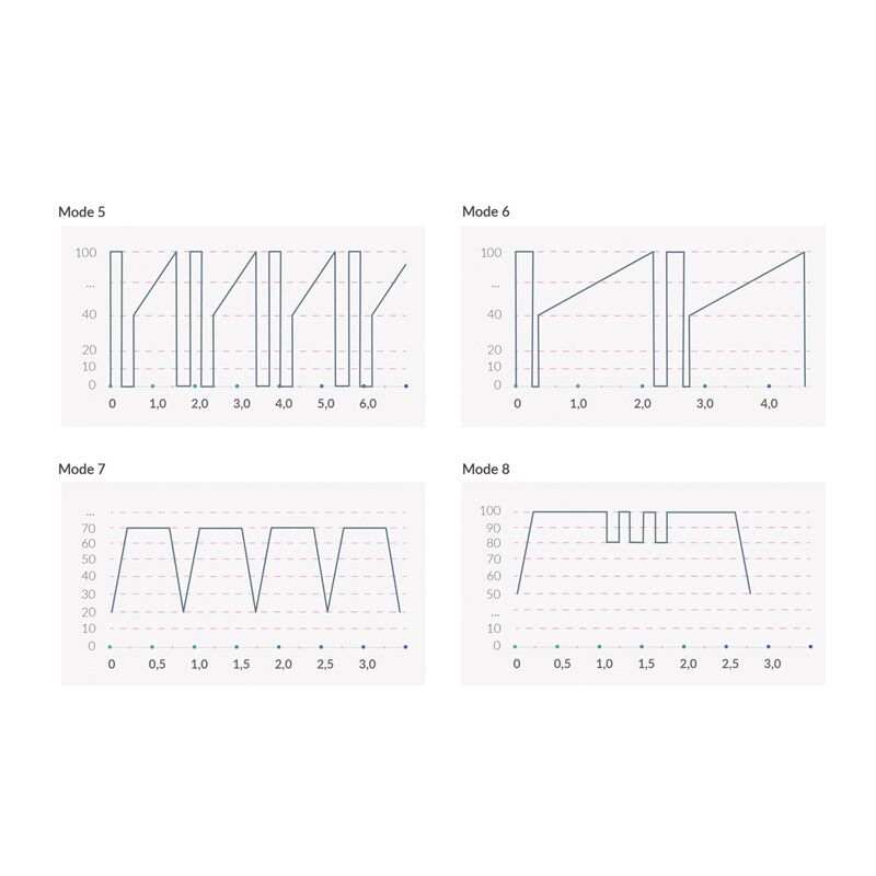 5 патернів електростимуляції: рівномірні поколювання, поколювання з чергуванням інтенсивності, рівномірна пульсація (імпульсний струм), пульсація різної інтенсивності, чергування поколювання та пульсації;
