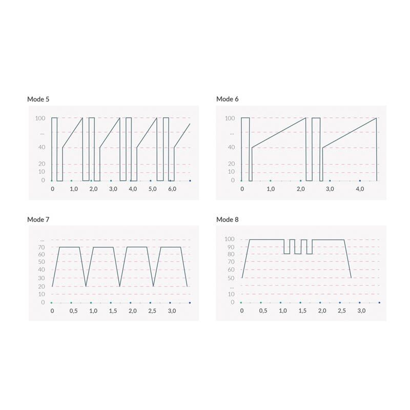 5 режимів електростимуляції: рівномірні поколювання, поколювання з чергуванням інтенсивності, рівномірна пульсація (імпульсний струм), пульсація різної інтенсивності, чергування поколювання та пульсації;