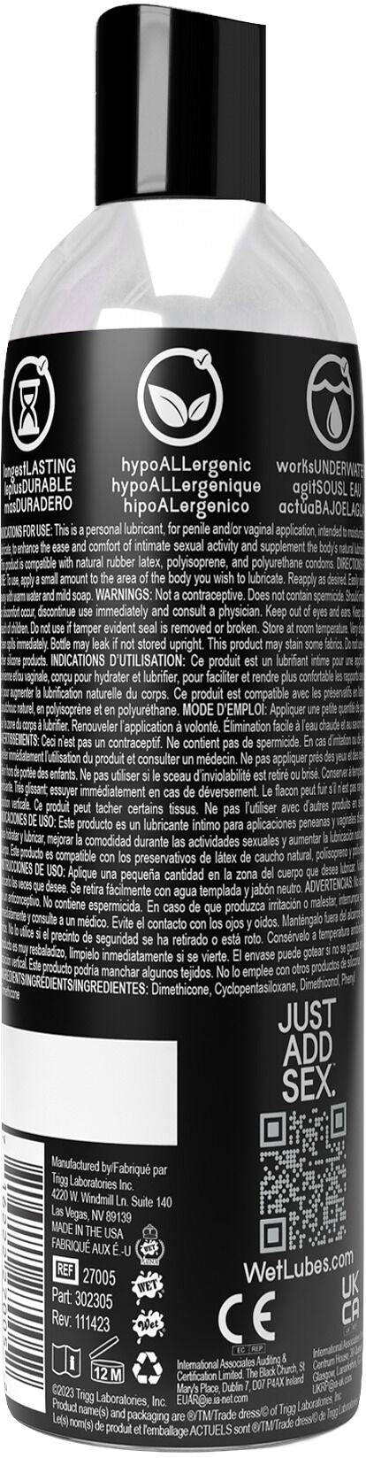 Якщо вам необхідно максимально тривале ковзання без липкості, за будь-яких умов і водночас повністю безпечне, то лубрикант на силіконовій основі Wet Pure Silicone Platinum — ваш вибір!