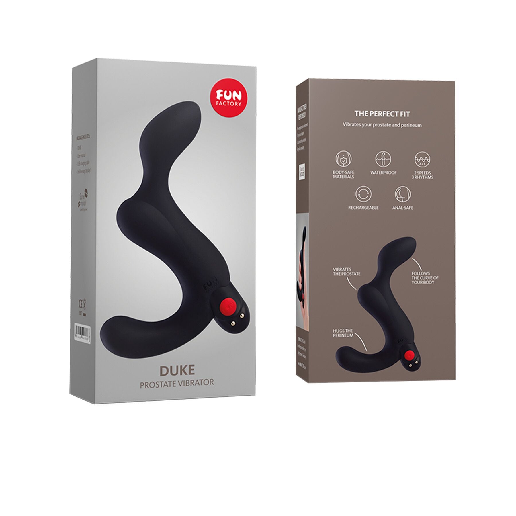 Дизайн масажера простати Fun Factory DUKE спеціально розроблений із додатковим вигином, зверненим назад — у той час, коли передня опуклість стимулює простату, вигин назад створює неймовірні відчуття наповненості.