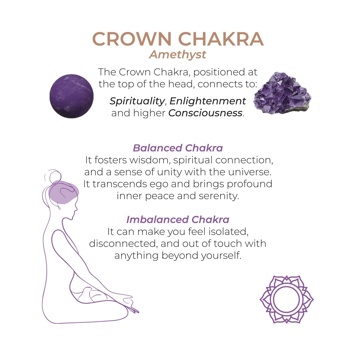 Аметист — насичено фіолетовий, різних відтінків. Він пов’язаний із духовністю, просвітленням та вищою свідомістю, відповідає за коронну чакру. Сприяє розвитку мудрості, духовного зв’язку та відчуттю єдності зі всесвітом. Маса 37 г.