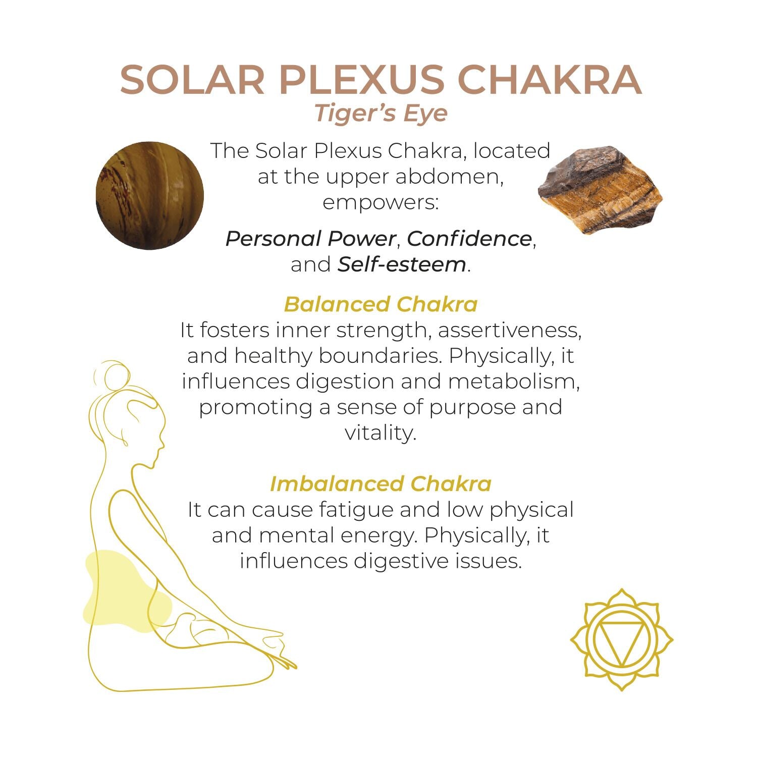 Тигрове око — переливчастий камінь, жовто-коричневий, до чорноти. Його чакра — чакра сонячного сплетіння. Робота над нею підвищує особисту силу, впевненість та самооцінку, поліпшує загальний обмін речовин. Маса 38 г.
