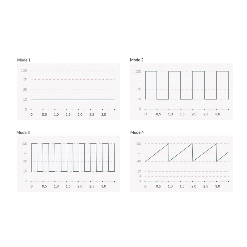 5 патернів електростимуляції: рівномірні поколювання, поколювання з чергуванням інтенсивності, рівномірна пульсація (імпульсний струм), пульсація різної інтенсивності, чергування поколювання та пульсації;