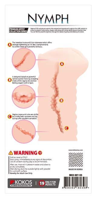 Під час створення NYMPH було досліджено вагіни жінок віком близько 30 років. У цьому мастурбаторі на внутрішній поверхні присутні складки і крапочки, досить великі, які будуть приємно охоплювати пеніс, даруючи прекрасні відчуття.
