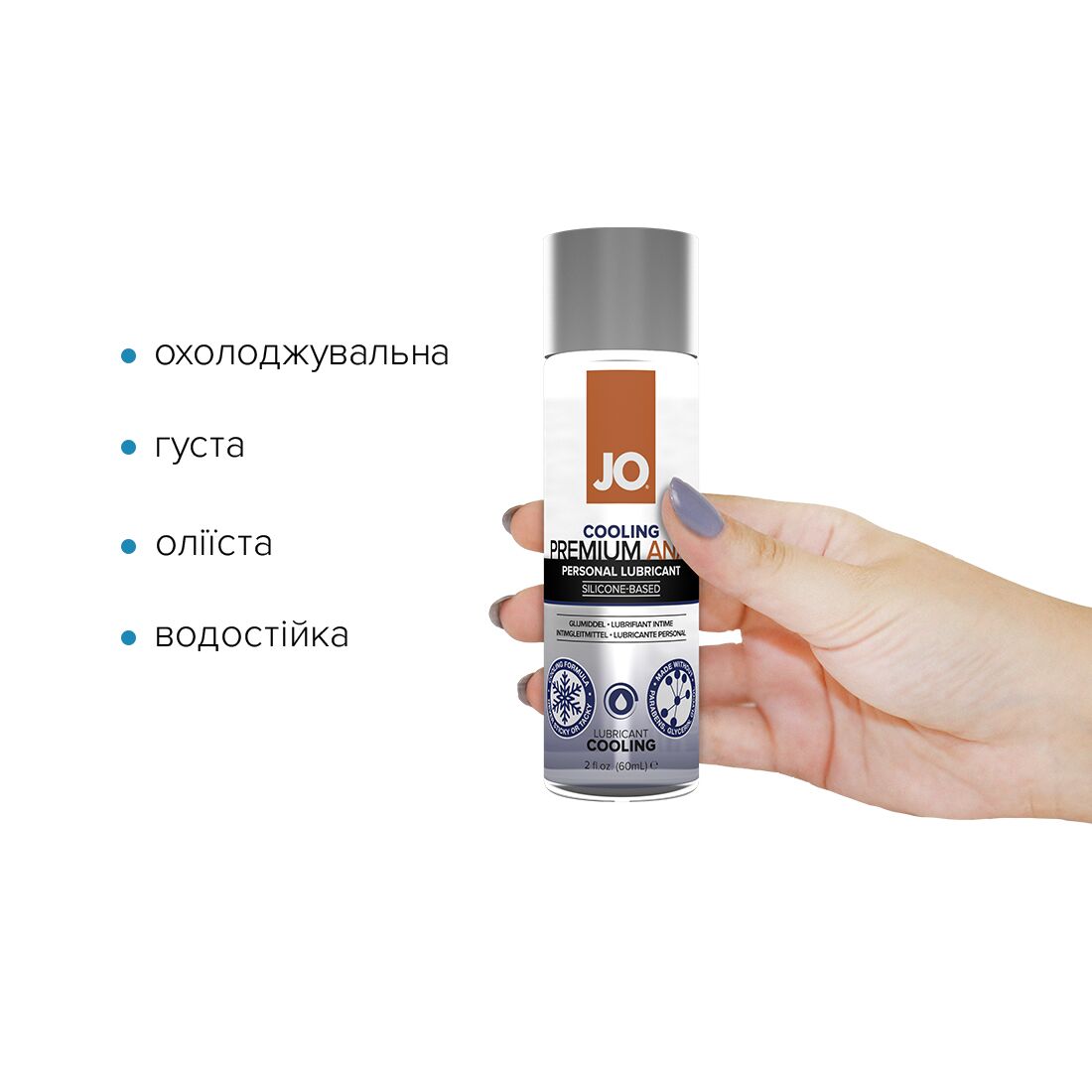 Лубрикант на силіконовій основі JO ANAL PREMIUM — COOLING (60 мл) з охолоджувальним ефектом не містить консервантів і виготовлений із використанням силікону найвищої якості. Завдяки супергладенькій оліїстій консистенції продукт забезпечує довготривале та плавне ковзання без особливих зусиль.