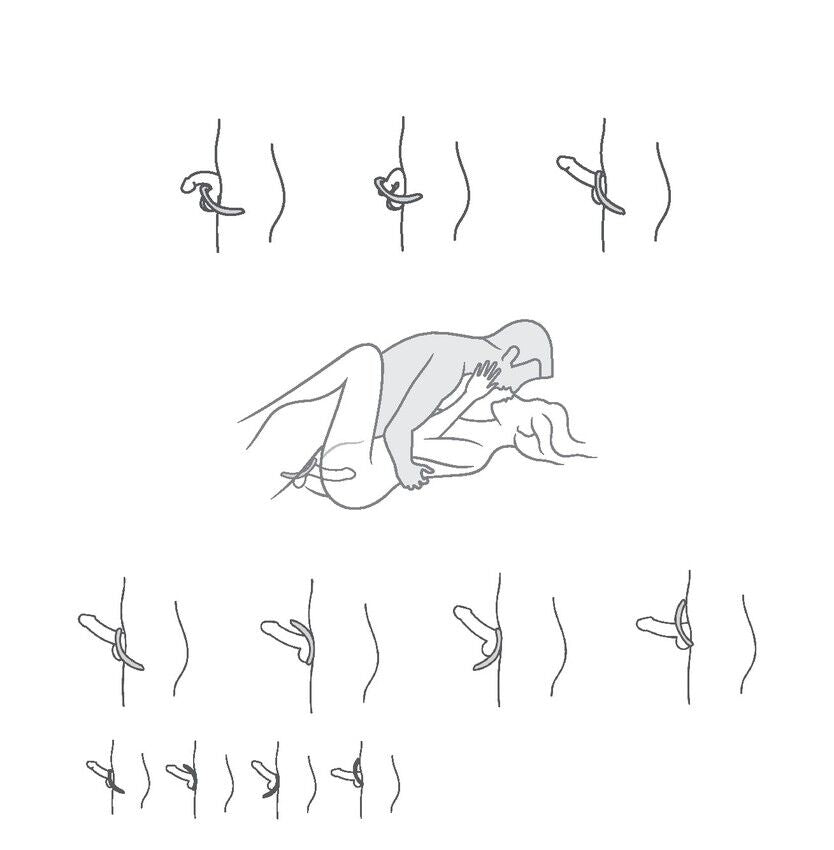 Безліч варіантів використання: змінюючи варіант розміщення кільця на члені та мошонці, можна стимулювати промежину чоловіка та клітор жінки.