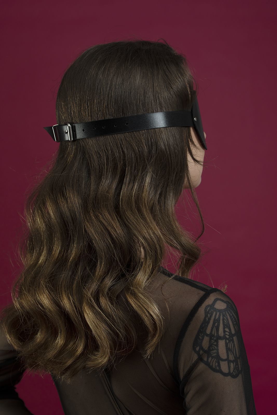 Маска красива, гладка і м'яка. Анатомічна форма повторює форму обличчя, забезпечуючи щільне прилягання і не пропускаючи світло. Виготовлена з високоякісної шкіри рослинного дублення та доповнена стильною фурнітурою сріблястого кольору.