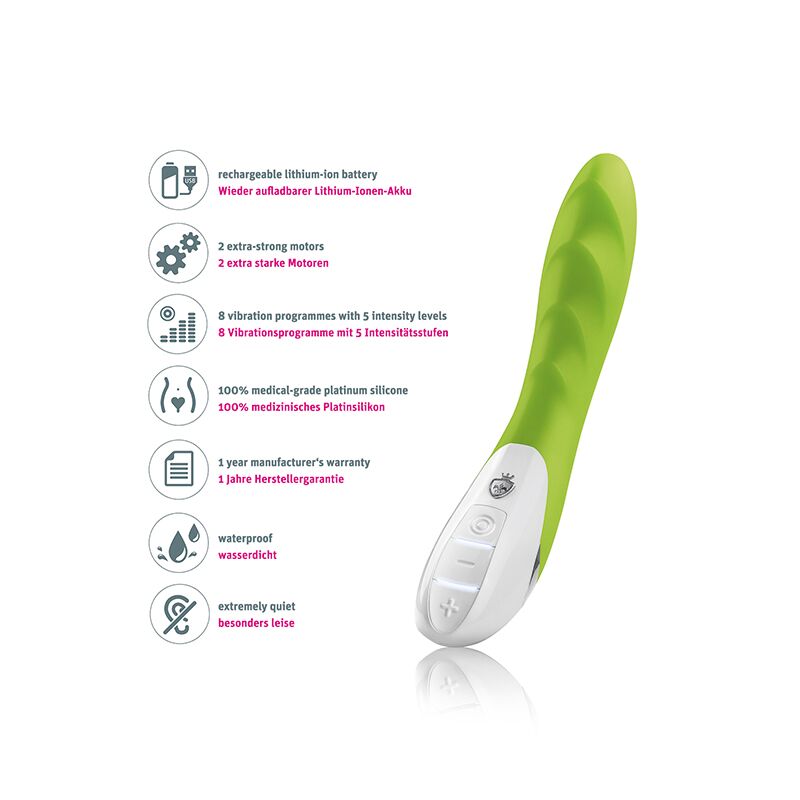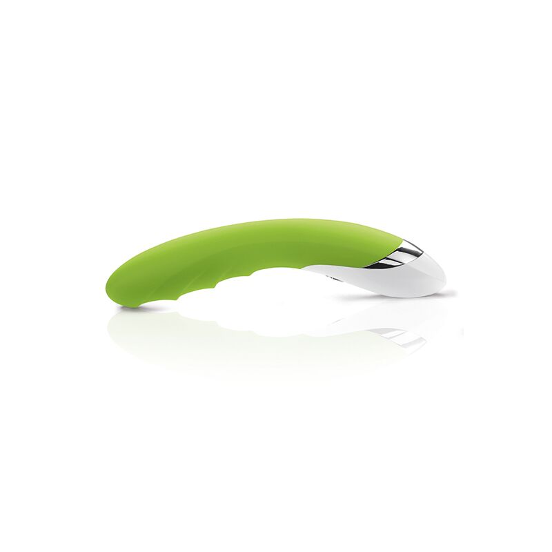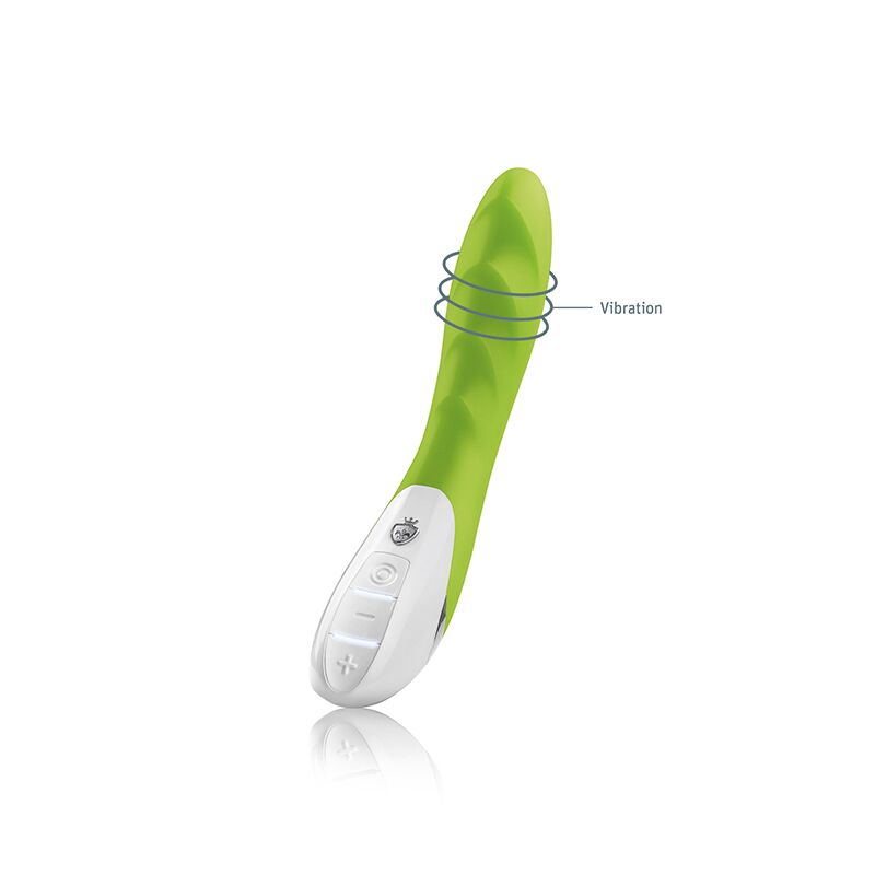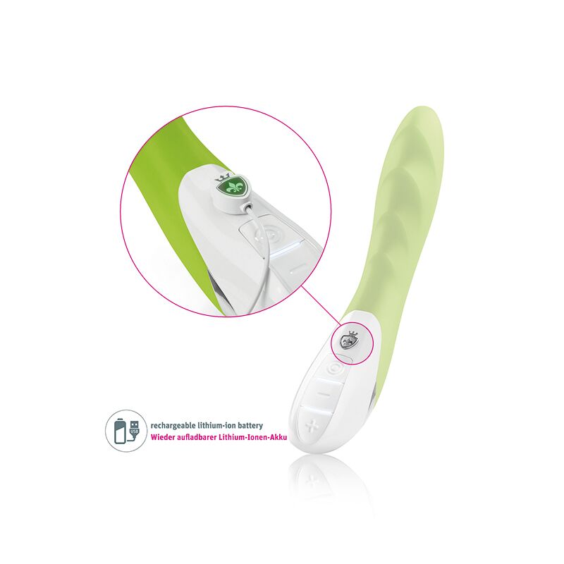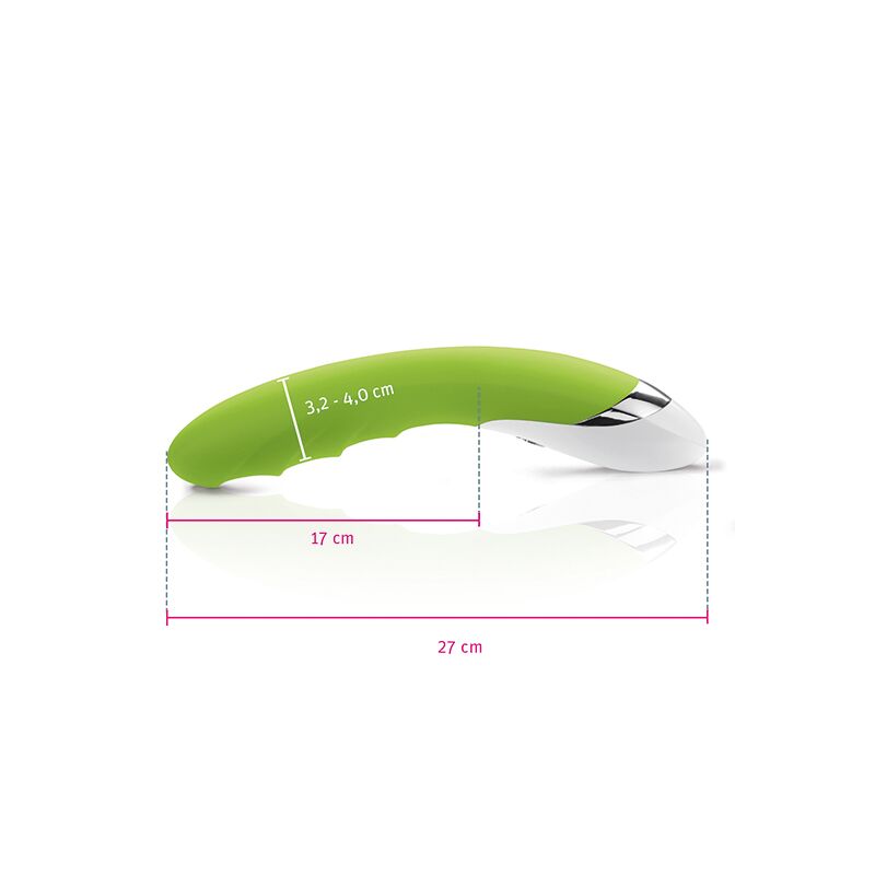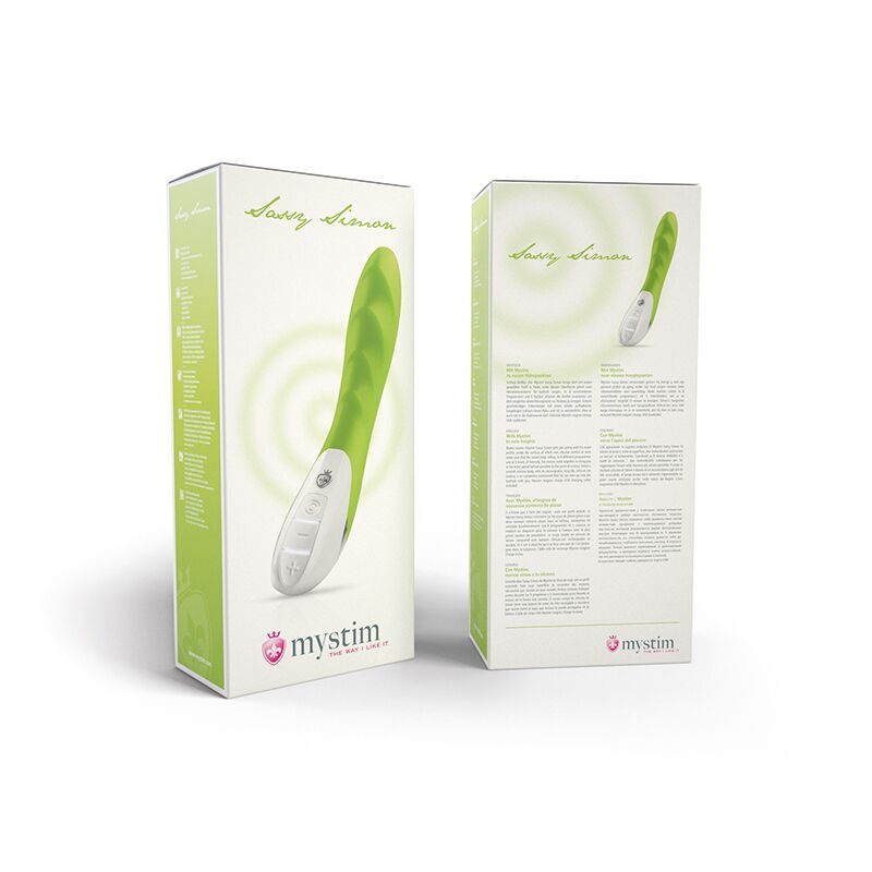 Красивий і яскравий, вібратор Mystim Sassy Simon Green створений для вашого повного задоволення. Покритий дорогим і якісним медичним силіконом, він приємний на дотик, його вигнута форма дозволяє дістати до точки G і стимулювати її своїми потужними вібраціями, а додаткові опуклості на стовбурі додають відчуттів, як при введенні, так під час стимуляції.