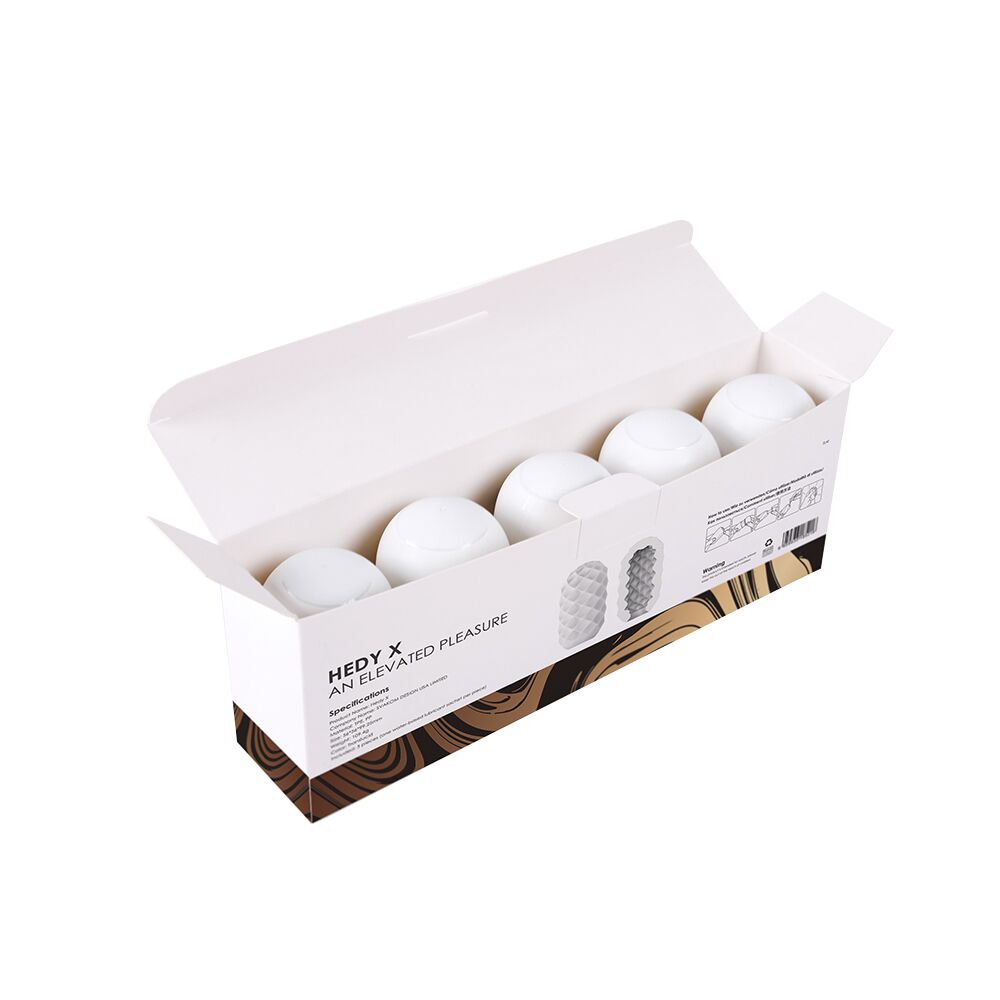 Яйця виготовлені з потовщеного ультра м'якого TPE для максимально яскравих відчуттів. Більш пружні, ніж стандартні Hedy! Матеріал є повністю безпечним для тіла. У набір яєць мастурбаторів Svakom Hedy X Confidence входить відразу 5 компактних яєць із дивовижною внутрішньою та зовнішньою текстурою. Яйце з щільним пористим малюнком всередині буде рівномірно і інтенсивно стимулювати стовбур по всій довжині. Для більш ніжної стимуляції виверніть яйце і насолоджуйтесь ребристим малюнком.