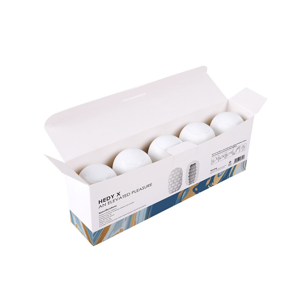 Яйця виготовлені з потовщеного ультра м'якого TPE для максимально яскравих відчуттів. Більш пружні, ніж стандартні Hedy! Матеріал є повністю безпечним для тіла. У набір яєць мастурбаторів Svakom Hedy X Reaction входить відразу 5 компактних яєць із дивовижною внутрішньою та зовнішньою текстурою. Це яйце всередині є скупченням великих пружних сфер, які створюють тиск на кожен міліметр пеніса, зовні сфери повторюються з меншою опуклістю. Ніжний матеріал добре розтягується, так що яйця ідеально підходять на будь-який розмір пеніса! У комплекті з кожним яйцем йде мініатюра лубриканта на водній основі (3 мл), тому можна відразу приступати до справи.