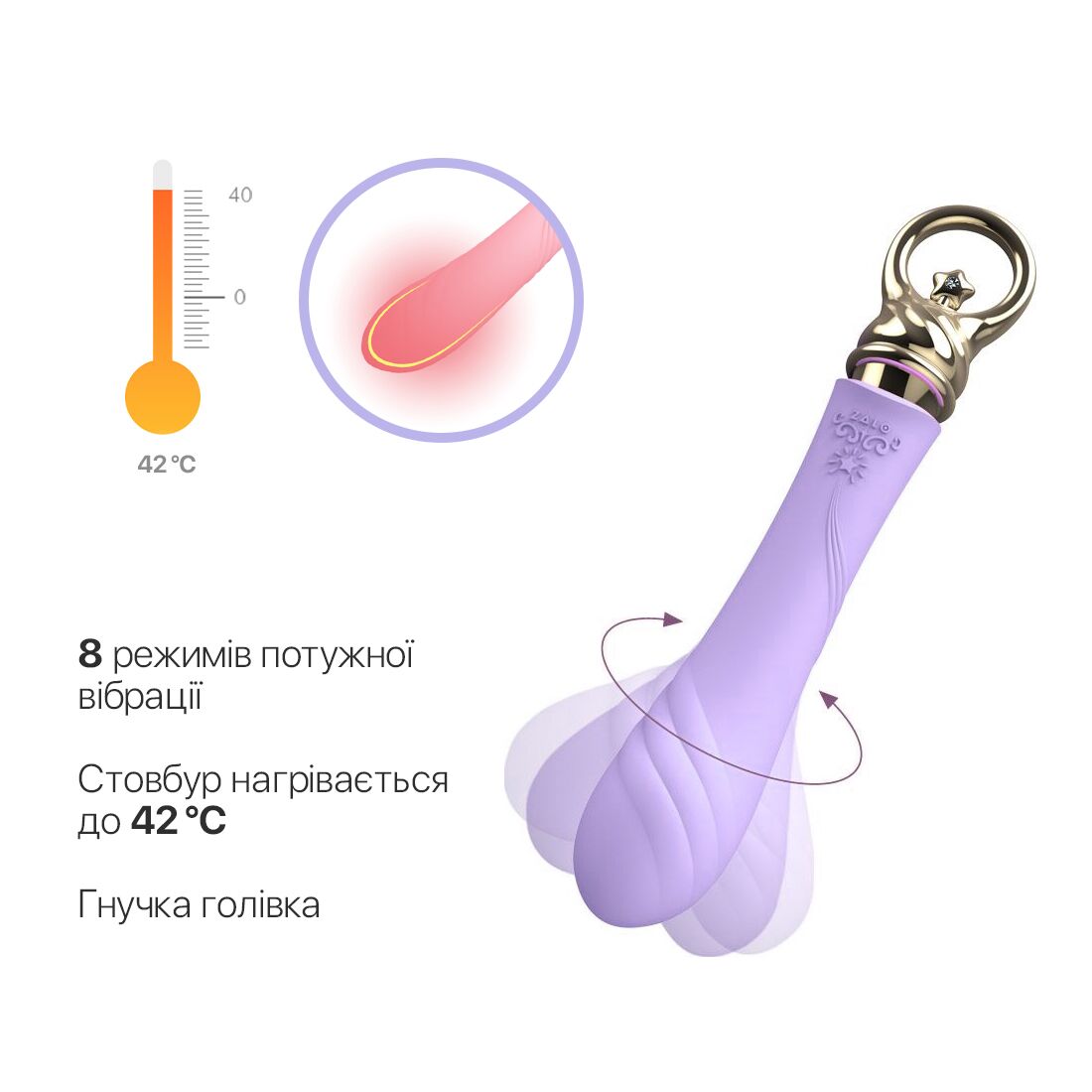 Цей вібратор поєднує в собі ніжність ліній та міць вібрацій, чари та задоволення фізичних бажань, красу та функціональність. Особливості вібратора для точки G із підігрівом Zalo Sweet Magic - Courage: