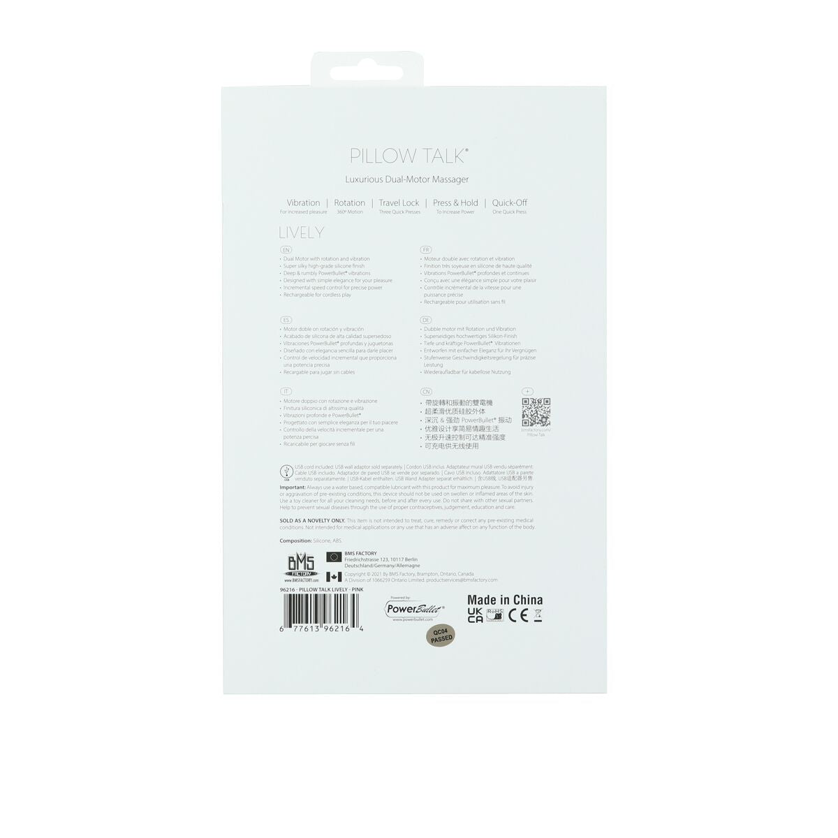 Розкішний кролик з ротацією та вібрацією Pillow Talk Lively виготовлений з абсолютно безпечних високоякісних матеріалів. Зверніть увагу: кролик не є водонепроникним, тому використовуйте для очищення спеціальні засоби.