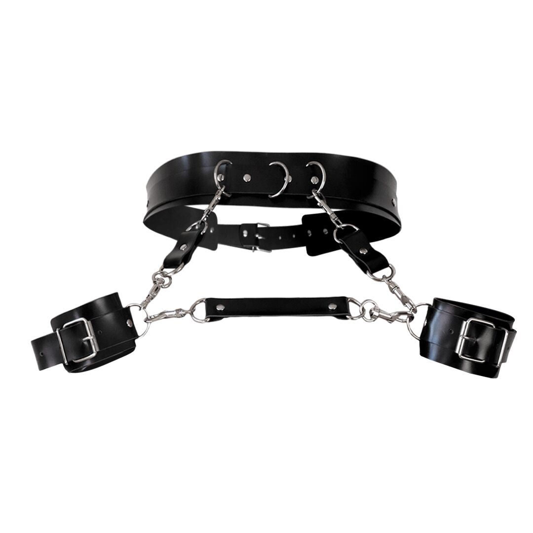 Цей девайс зроблений з натуральної шкіри, усі його елементи міцно з’єднані між собою металевою фурнітурою — кільцями та карабінами. Наручники та пояс легко регулювати залежно від того, наскільки сильно ви хочете затягнути партнеру талію та зап’ястя. Широкі наручники м’яко лягають на шкіру й за допомогою конекторів можуть з’єднуватися між собою та поясом. Другий варіант ідеальний, якщо ви хочете частково знерухомити партнера. Цей девайс дуже добре поєднується з іншими аксесуарами BDSM-практик і може принести багато захопливих моментів.