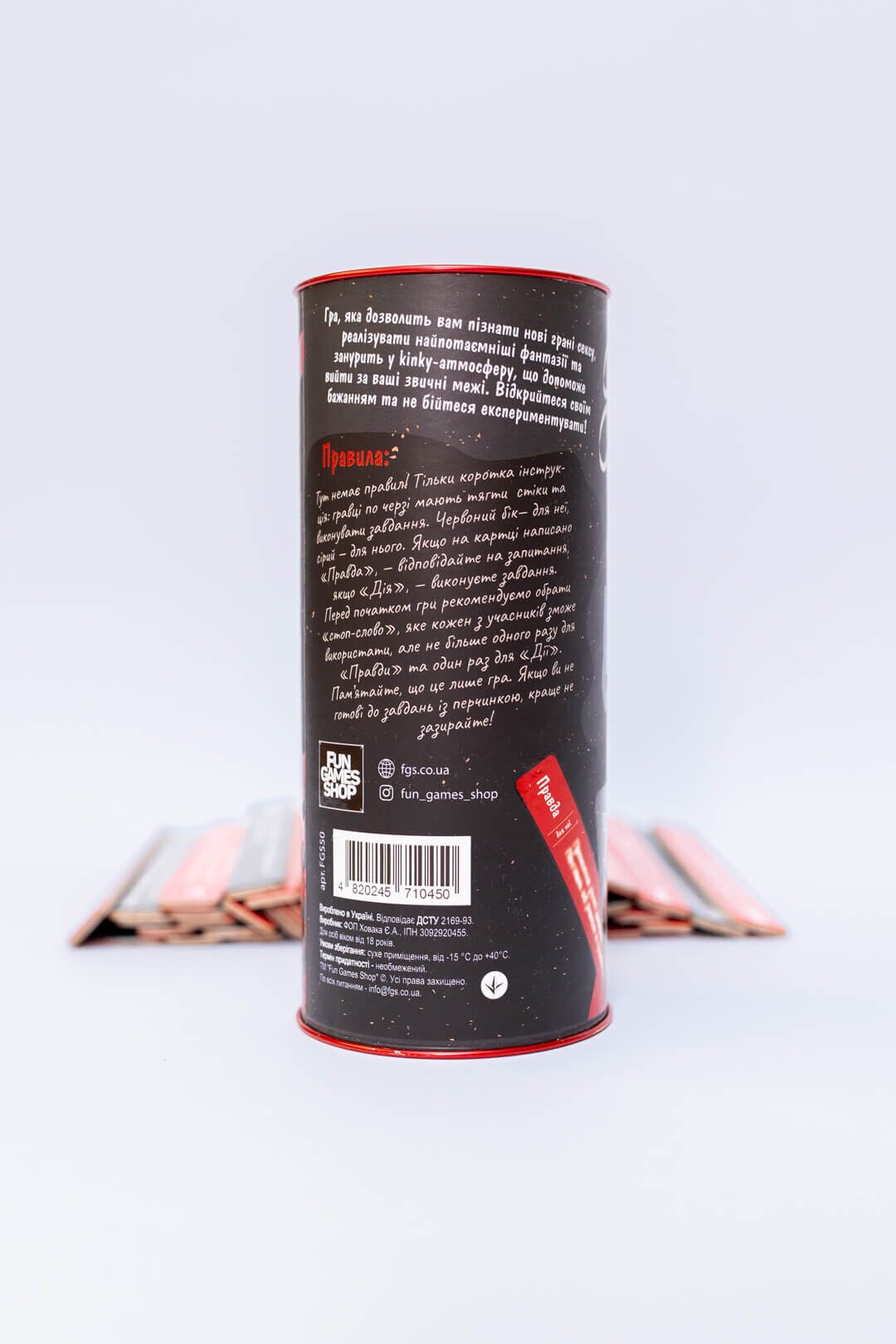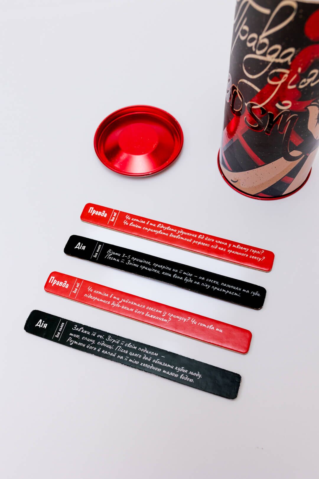Коротко про правила: Тут немає правил! Тільки невелика інструкція: ви по черзі тягніть стіки. Червона сторона - завдання для неї, Сіра - завдання для нього. Якщо на стик написано «Правда» - відповідайте на питання, якщо «Дія» - приступайте до завдання. Перед початком гри рекомендуємо вибрати «стоп-слово», яке кожен з учасників може використовувати, але не більше одного разу для стіків «Правда» і «Дія». Пам'ятайте, це гра. Але якщо ви не готові, краще не дивіться під кришку!