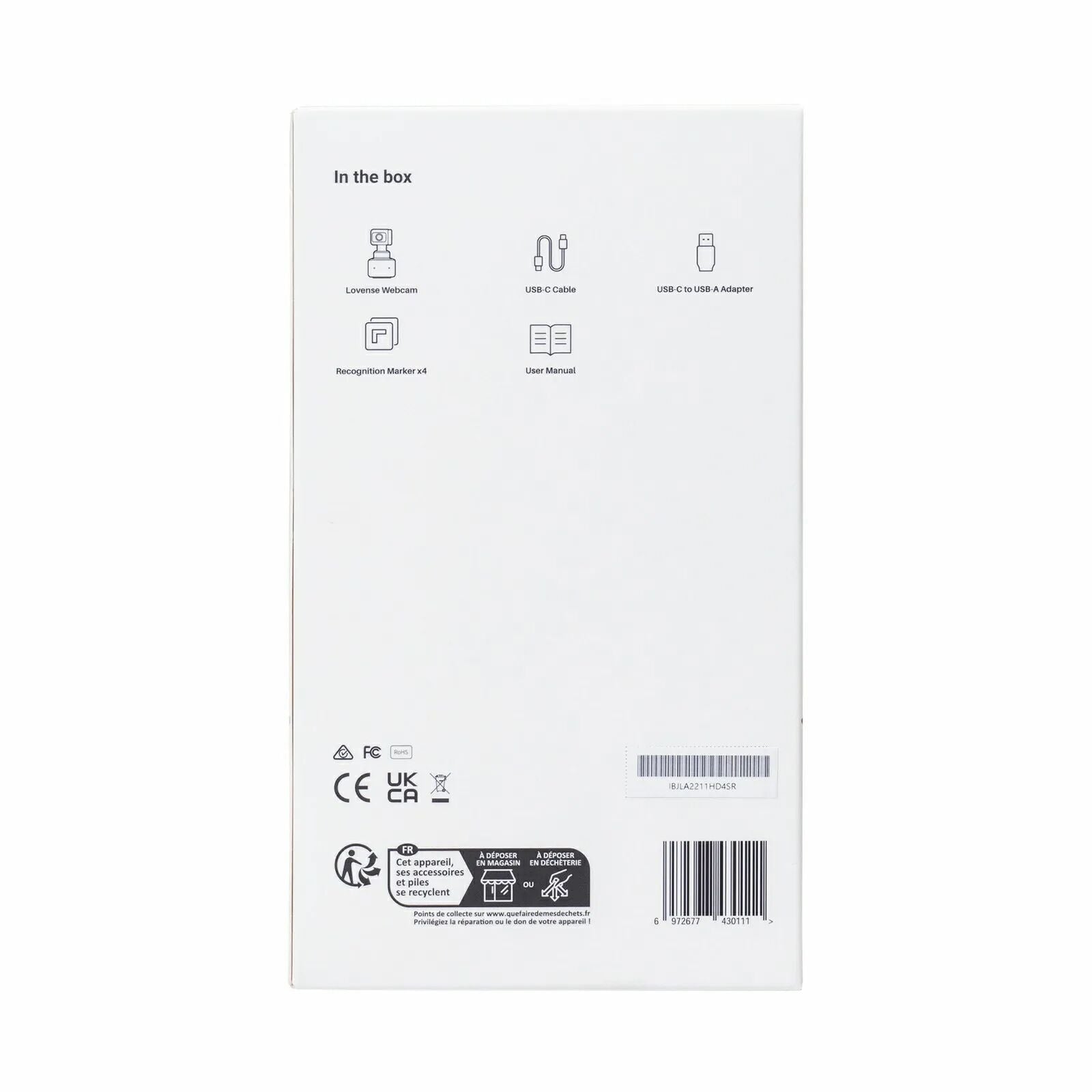 До комплекту, крім 4К вебкамери зі штучним інтелектом Lovense WebCam, входить кабель USB-C, перехідник із USB-C на USB-A, маркер розпізнавання (4 шт.) та інструкція користувача. Відеогід з налаштування камери для роботи з різними платформами ви знайдете на офіційному сайті lovense.com.