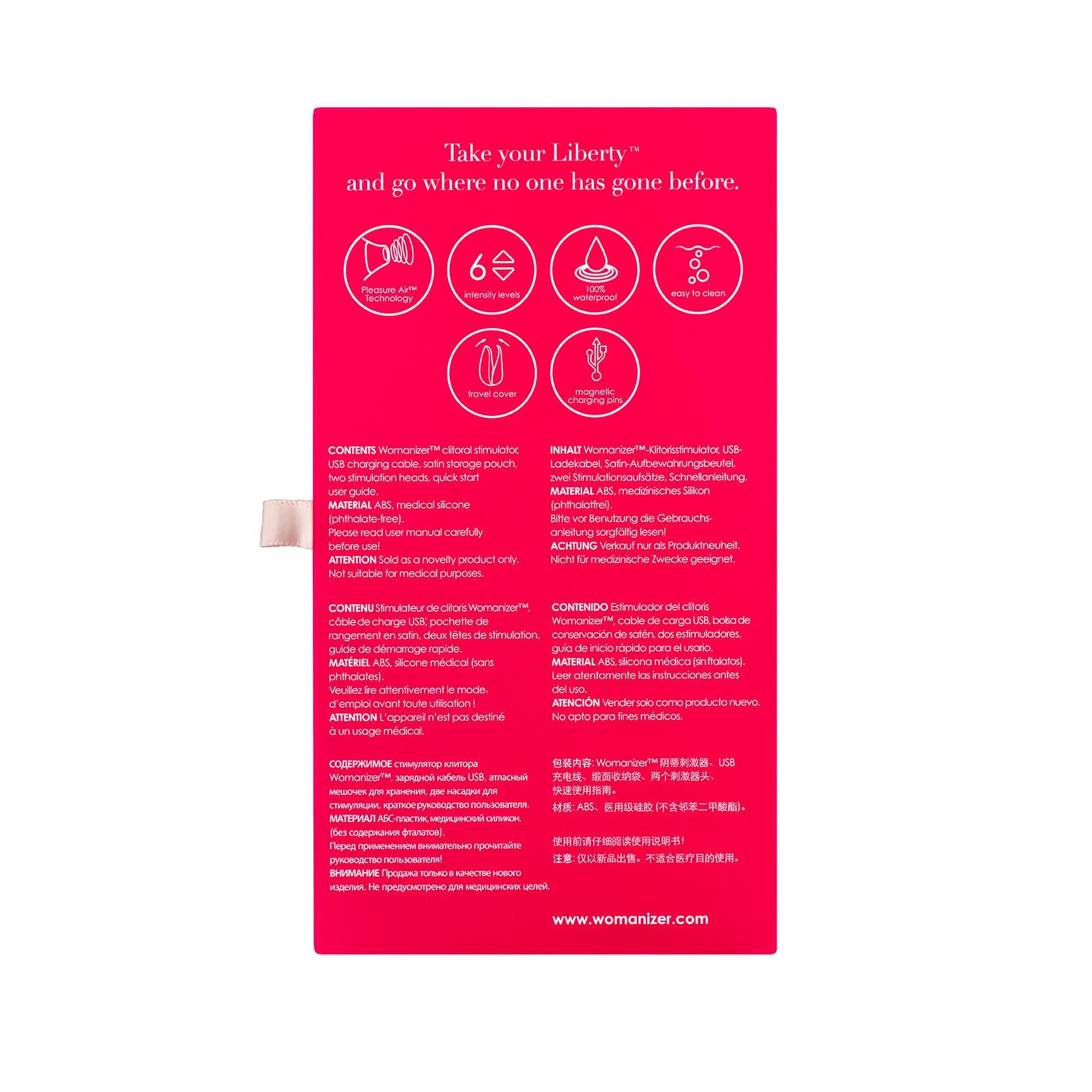 Компактний вакуумний кліторальний стимулятор Womanizer Liberty з магнітною кришкою стане вашим найкращим другом у всіх ваших поїздках. Іграшка легко поміщається в косметичці або кишені, а магнітна кришка захистить від деформації у валізі та від потрапляння пилу під час транспортування. Також ця модель ідеальна для тих, хто віддає перевагу компактним секс-іграшкам, які легко утримувати в руці.