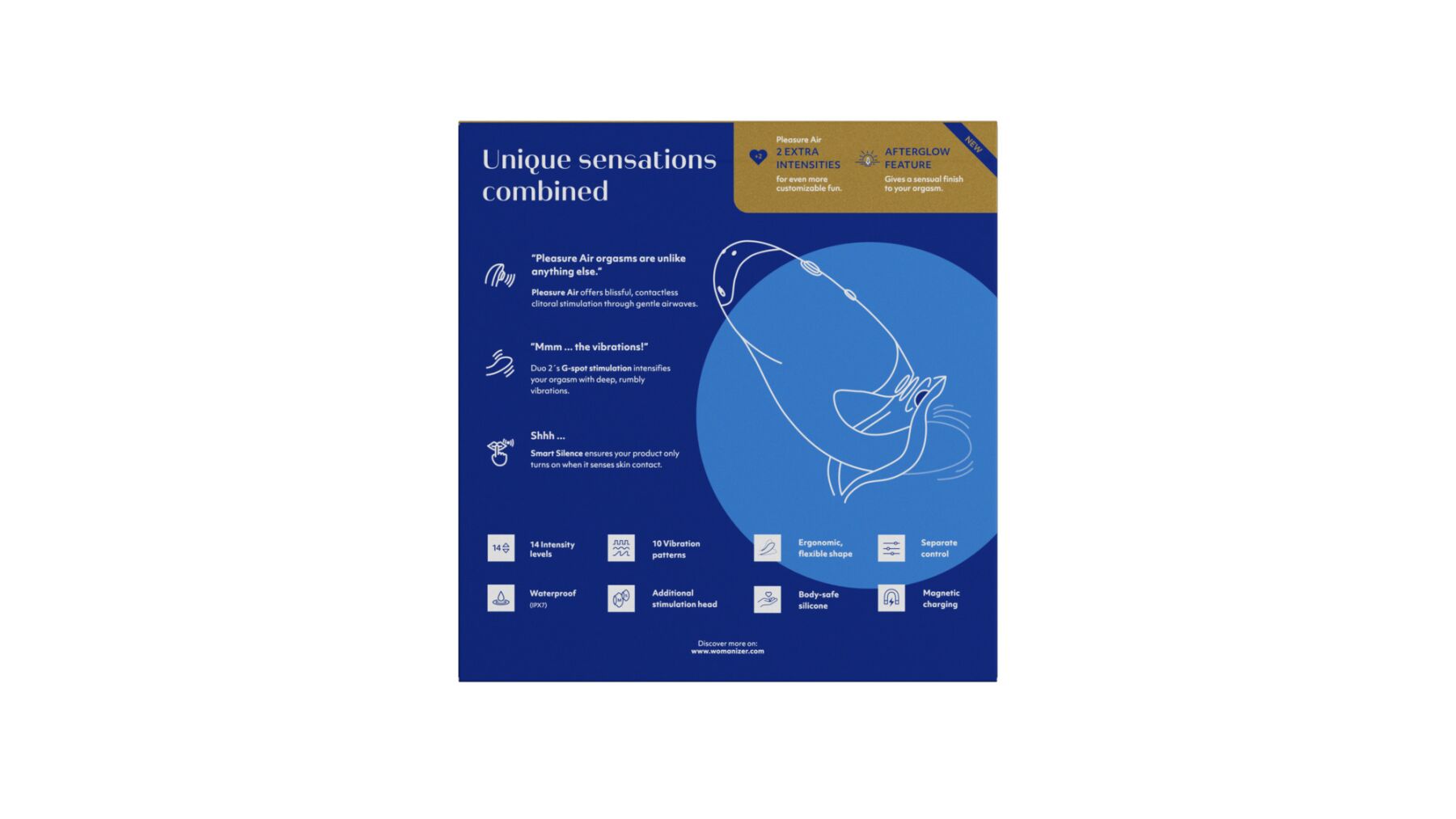 функція Afterglow: унікальне рішення, що дає змогу подовжити оргазмічні відчуття (під час натискання кнопки Afterglow вмикається особливо ніжний вакуум для легких пестощів клітора для додаткового задоволення — спробувавши Afterglow один раз, ви більше не зможете від нього відмовитися!);