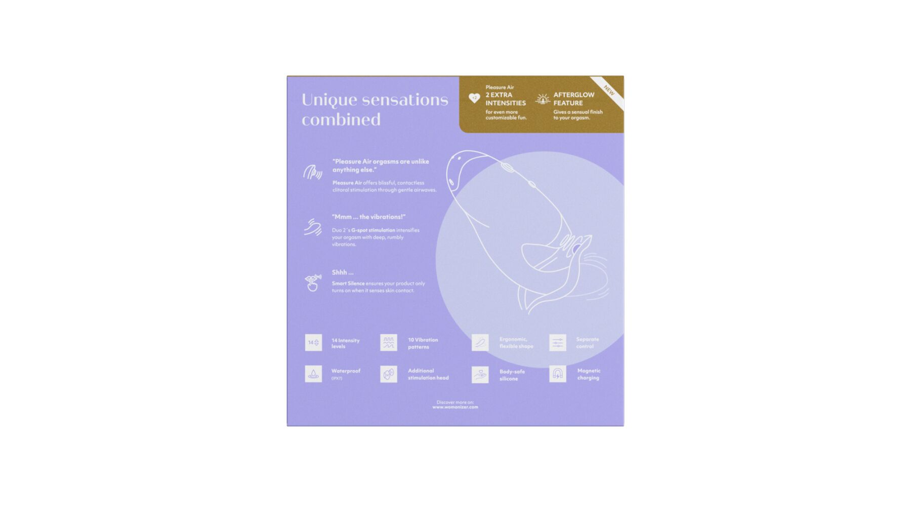 функція Afterglow: унікальне рішення, що дає змогу подовжити оргазмічні відчуття (під час натискання кнопки Afterglow вмикається особливо ніжний вакуум для легких пестощів клітора для додаткового задоволення — спробувавши Afterglow один раз, ви більше не зможете від нього відмовитися!);