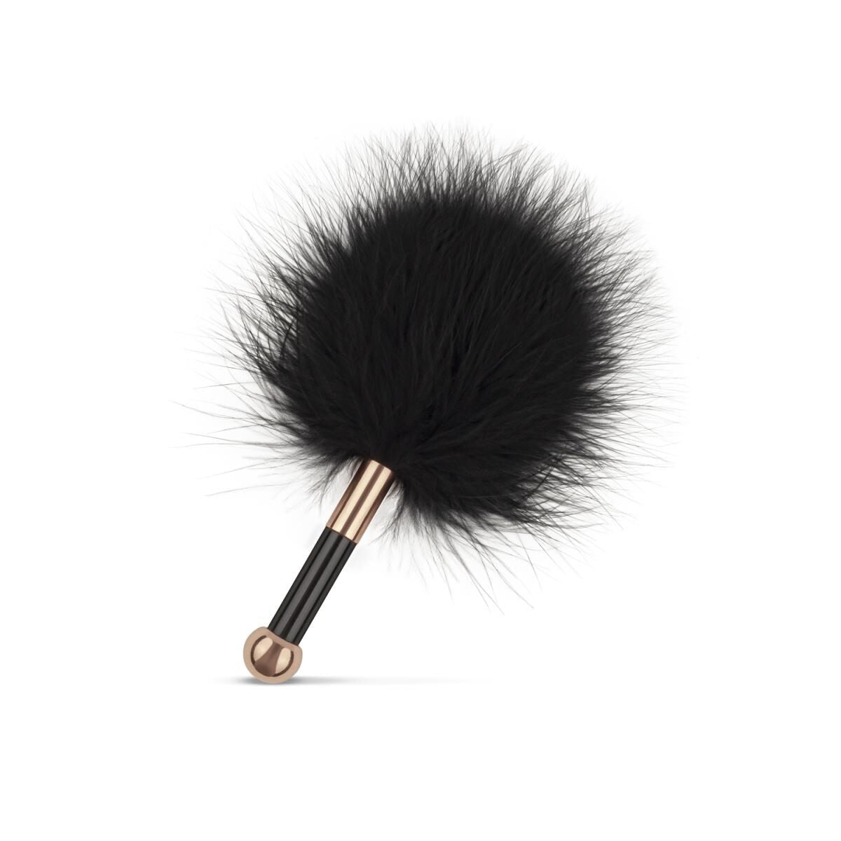 Набір виконаний зі штучної шкіри та фурнітури чорного та кольору рожевого золота. Це незвичне поєднання додає розкоші кожному аксесуару. М’які широкі наручники та поножі чудово фіксують зап’ястя та щиколотки, водночас не травмуючи їх. Ланцюжки з карабінами дають змогу з’єднати між собою аксесуари або приєднати їх до інших предметів — ліжка, хрестовини тощо. Тонкий стильний нашийник має дуже привабливий вигляд на ніжній шиї. Довгий повідець-ланцюг кріпиться до кільця на нашийнику. Металеві затискачі на соски захищені м’якими наконечниками, щоб не пошкодити ніжну шкіру грудей. Силу стиснення можна регулювати повзунком. Прикрашені затискачі чорними пір’їнками. Довга шльопалка і м’яка коротка лоскоталка можуть взаємовиключати один одного, а можуть працювати в парі: почергове ніжне погладжування і відчутне шльопання прикутого партнера можуть викликати бурю збудження. Закрийте коханому очі широкою атласною стрічкою — і сміливо проводьте чуттєві експерименти над його тілом, що прагне пестощів та покарань. Додайте до солодкої тортури крапельки воску зі свічки, яка тане за мінімальних температур, і ви отримаєте неймовірний набір, експериментувати з яким можна практично нескінченно.