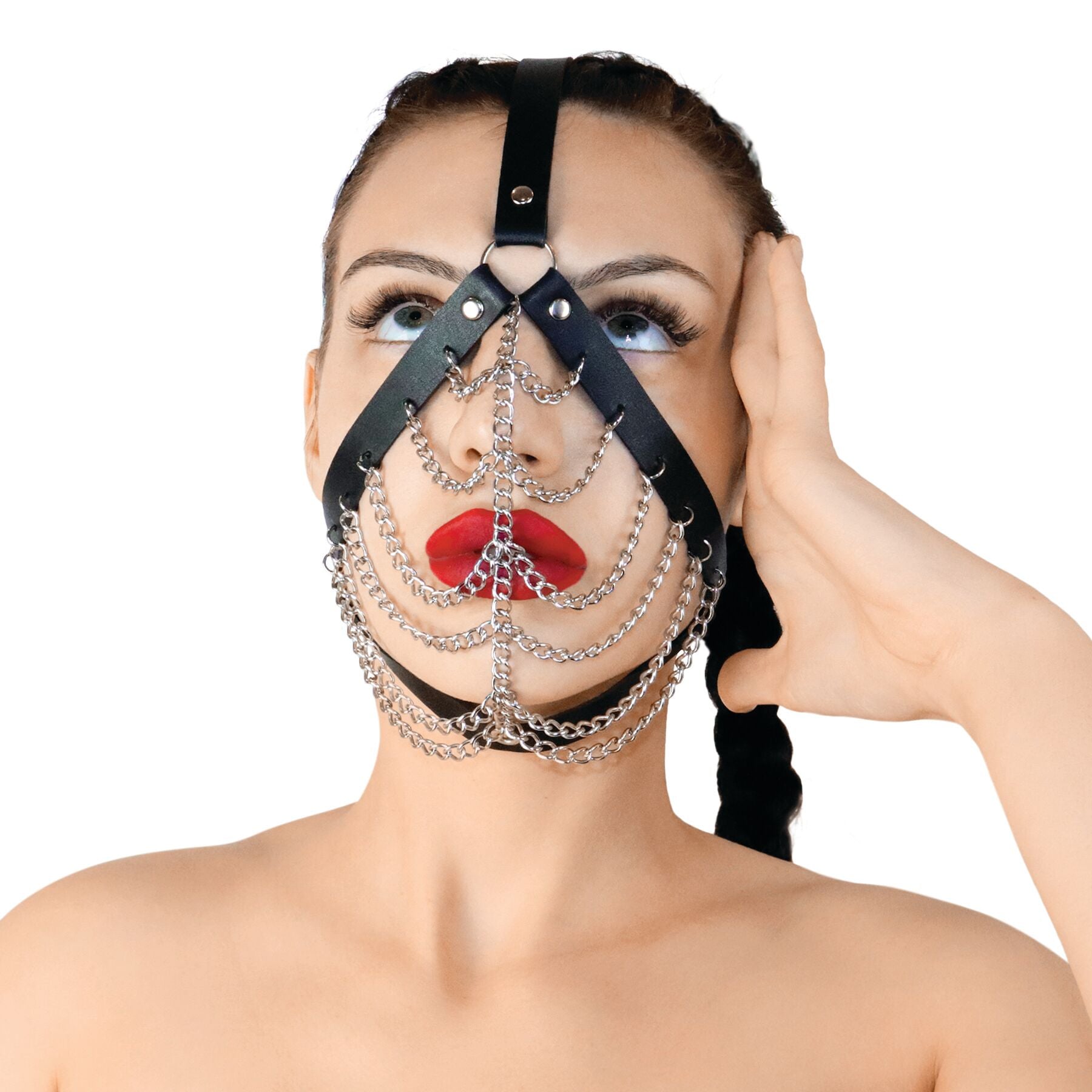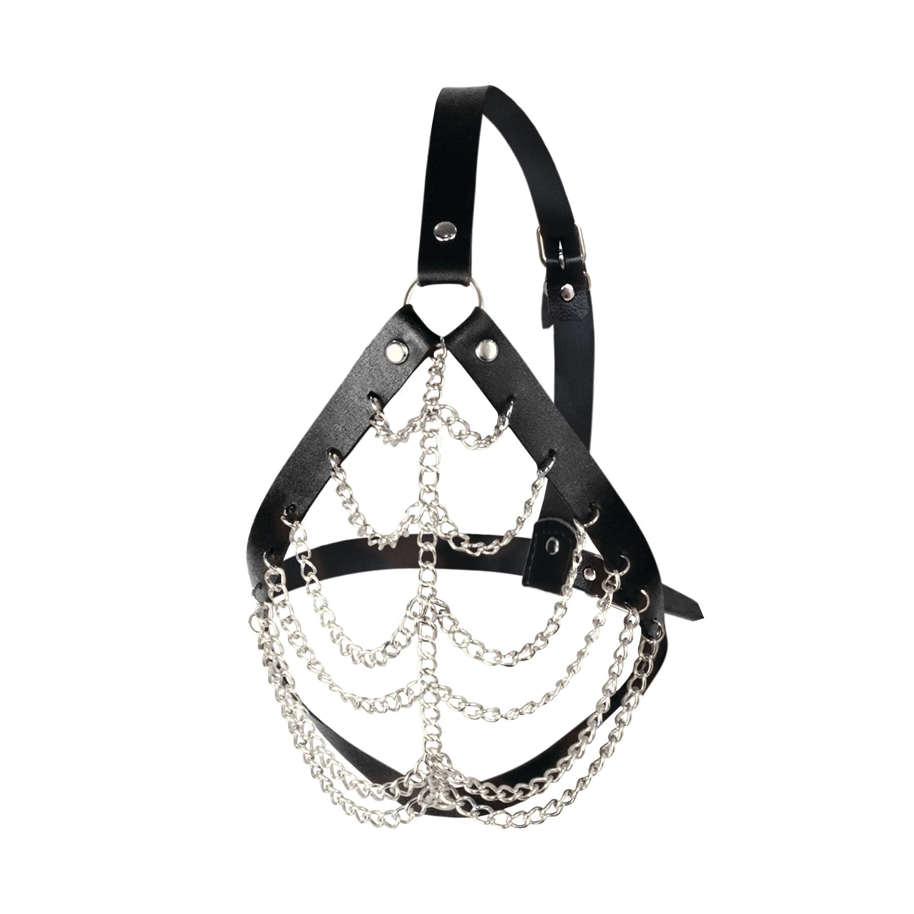 Металеві ланцюжки, які прикрашають маску, надають їй таємничий і екзотичний вигляд. Кожен ланцюжок дбайливо приєднаний до маски, створюючи оригінальний візерунок та вражаючий контраст між м'якістю шкіри та суворістю металу.