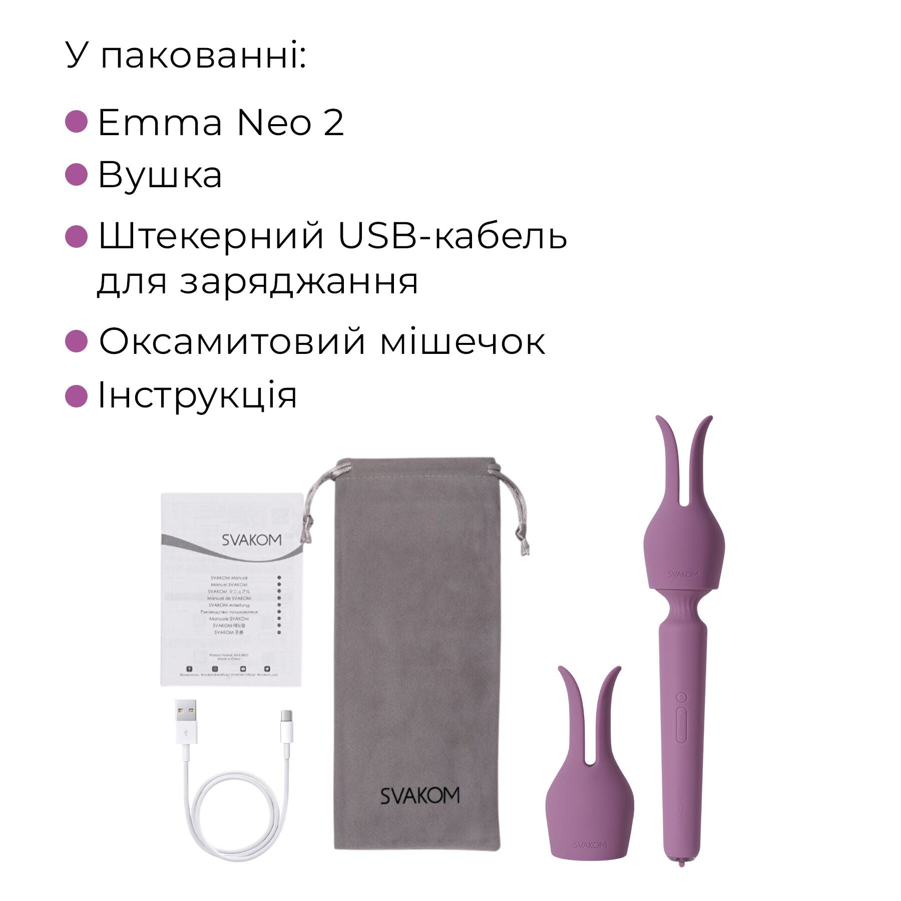 Інтерактивний вібромасажер із підігрівом Svakom Emma Neo 2 — це наступне покоління подібних масажерів. Його можна використовувати як для масажу будь-яких зон та зняття напруження з м’язів, так і для збуджувальної стимуляції ерогенних зон. Насадка-вушка ще більше розширює можливості, адже їх можна вводити всередину!