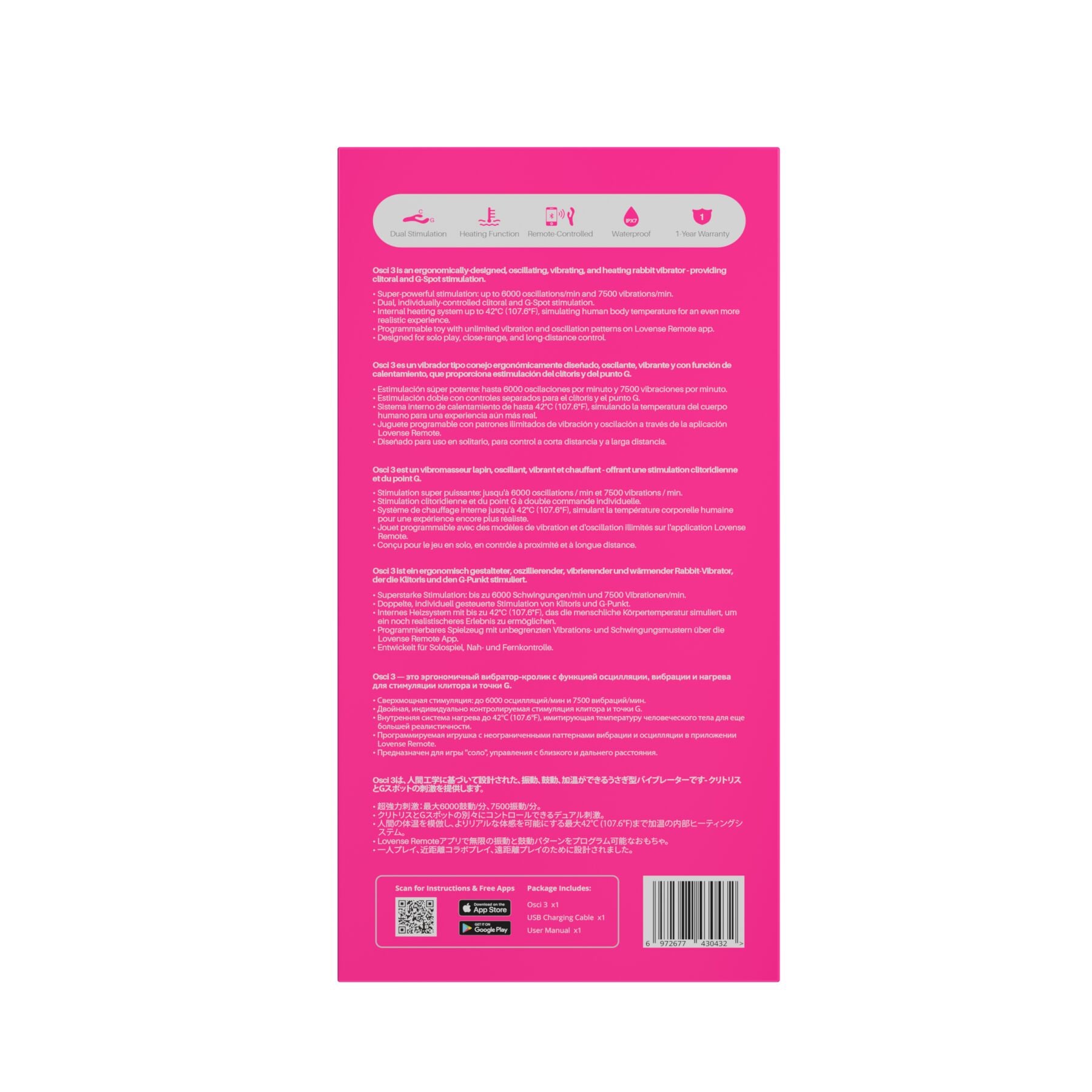 Хочете відчути суперпотужну всеосяжну стимуляцію всіх головних ерогенних зон? Тоді рекомендуємо купити осцилювальний смарт вібратор-кролик для точки G Lovense Osci 3. Спеціальний майданчик на кінці іграшки рухається вгору-вниз (осцилює) і ніби постукує по чутливій точці G. На відміну від попередньої моделі, у цього вібратора є відросток для стимуляції клітора, а головне, вбудовано два мотори з автономним керуванням (один відповідає за вібрацію, другий — за осциляцію). Тепер можна насолоджуватися тільки цілеспрямованою стимуляцією точки G осцилювальним майданчиком, використовувати іграшку як класичний вібратор-кролик або увімкнути вібрацію й осциляцію одночасно та поринути в океан всеосяжної насолоди! Без під’єднання до смартфона працює в 7 режимах вібрації та 9 режимах осциляції, а під час роботи через застосунок відкривається безліч більш цікавих і незвичайних можливостей. Завдяки підігріву момент проникнення відчувається максимально комфортно та природно. Іграшка повністю водонепроникна (IPX7) для захопливих ігор у ванні.