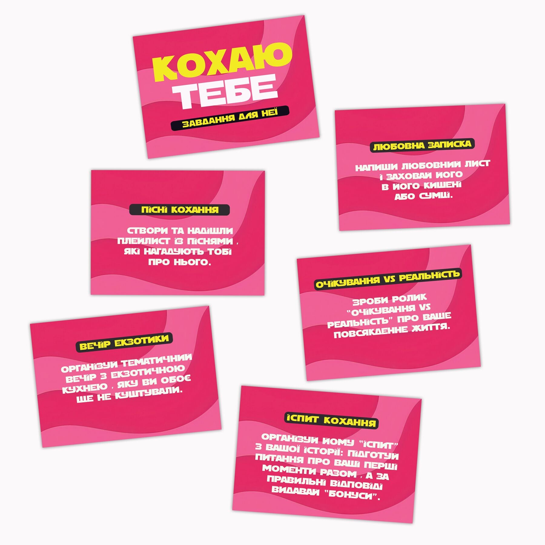 Завдання на картці — це романтична дія, жест або сюрприз, який потрібно підготувати і виконати для своєї половинки.