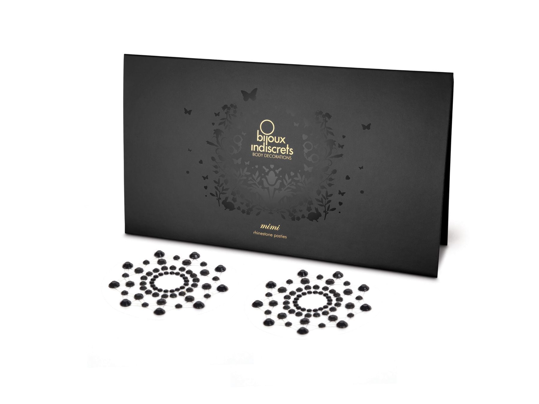 Bijoux Indiscrets MiMi - грайливе і дуже незвичайна прикраса для грудей зробить їх ще більш сексуальними і чарівними. Композиція зі стразів складає парні аксесуари з кристалів чорного кольору. Їх слід наклеїти таким чином, щоб сосок виявився у центрі кола. Кристали легко кріпляться за допомогою самоклеючої основи, що робить їх неймовірно зручними у використанні. Прикраси призначені для одноразового використання, однак, якщо користуватися ними акуратно, багаторазове застосування стає можливим. Просто нанесіть на основу крапельку клею для вій (тільки для зовнішнього використання!) перед тим, як прикріпити прикраси до шкіри.