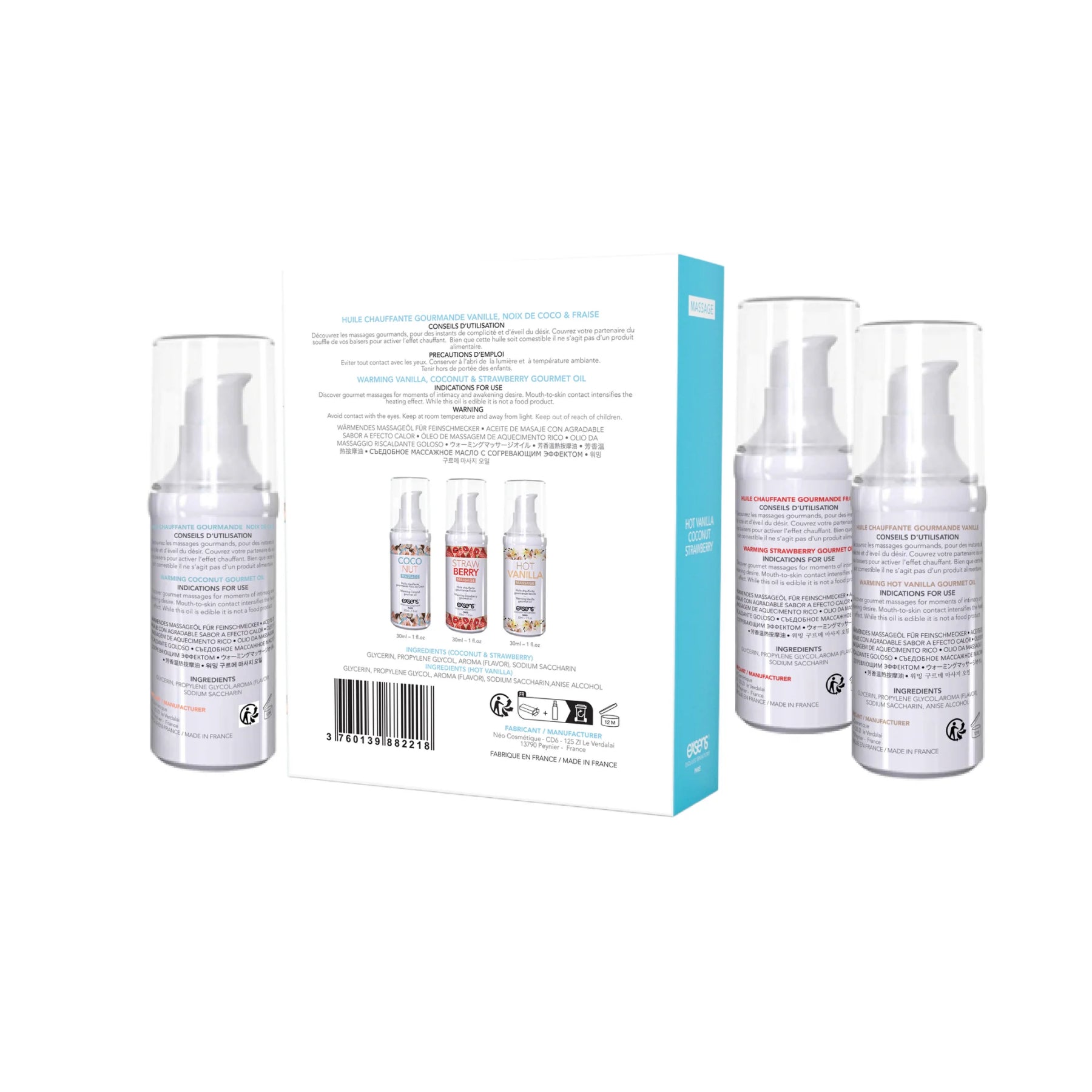 Представляємо вашій увазі набір з трьох масажних олій, з ароматом кокоса, полуниці і ванілі, кожна по 30 мл. Упаковано в легкі пляшечки з дозатором, які зручно брати з собою в поїздки або використовувати вдома. Масажна олія з зігріваючим ефектом допомагає розслабитися, пом'якшує шкіру і надає їй ніжний аромат полуниці, кокоса або ванілі. Спробуйте її ще й на смак! Солодкувата, без гіркого присмаку, вона залишить приємний післясмак. Не містить цукру і парабени.