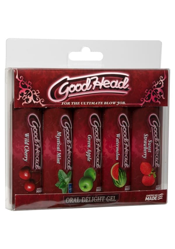 Ніжний смачний гель тепер не тільки освіжає подих, а й робить мінет максимально приємним для обох учасників процесу! Рекомендуємо придбати змазку-гель для орального сексу Doc Johnson GoodHead, набір 5х29 мл - відразу 5 упаковок з різними смаками під будь-який настрій: полуниця, вишня, кавун, м'ята і яблуко! Без цукру і парабенів, не липкий і дуже-дуже густий, цей гель для орального сексу полегшує ковзання під час мінету і ніжно обволікає горло для максимально приємних відчуттів.