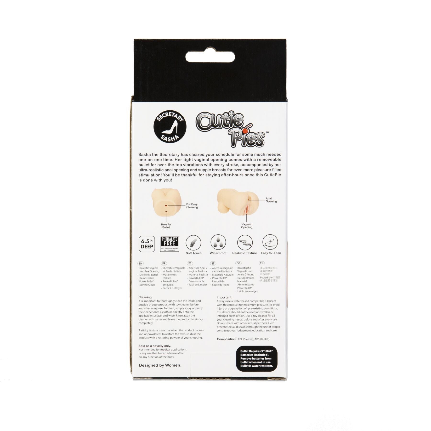 Ви завжди мріяли про слухняну сексуальну секретарку? Ваші мрії здійснилися з мастурбатором-вагіною та попкою Cutie Pies Secretary Sasha Vagina & Ass Masturbator. Ваша нова сексапільна помічниця Саша завжди готова до вагінального сексу або аналу, та за першим покликом оголює свої шикарні груди. Зустрічайте Cutie Pies: колекцію реалістичних мастурбаторів із пристрасними персонажами. Ці дами виготовлені з ультрам’якого, еластичного й дуже приємного на дотик матеріалу — термопластичного еластомеру та оснащені реалістичними отворами для нескінченного задоволення. Мастурбатори легко миються, мають оптимальний розмір та завжди готові до розваг. У комплекті з кожною іграшкою ви знайдете ще й віброкулю в подарунок.