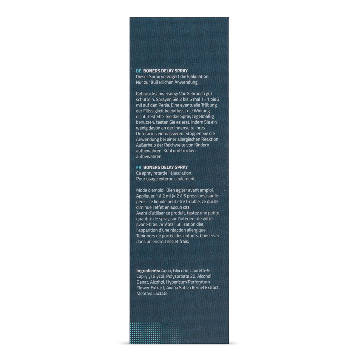 Як використовувати спрей-пролонгатор Boners Delay Spray? Струсіть флакон перед використанням і розпорошіть від 2 до 5 разів на свій пеніс. Обов’язково дайте засобу всотатися до інтимної близькості, щоб анестетичний ефект не поширився на партнера або партнерку. Рекомендується перед першим використанням протестувати спрей на руці. Негайно припиніть використовувати спрей у разі виникнення подразнення або алергічної реакції.